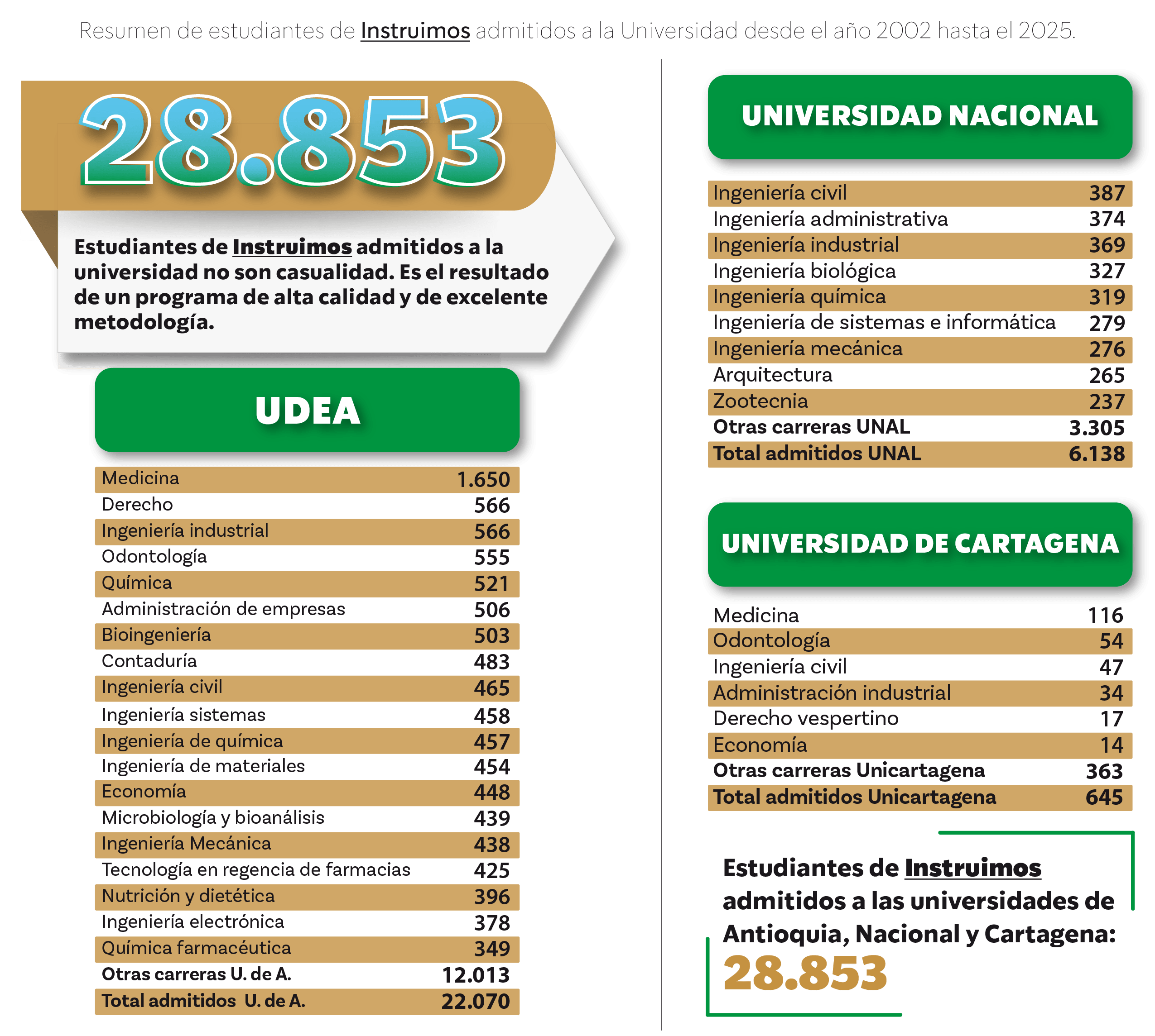 Resumen de estudiantes de Instruimos; admitidos a la universidad desde el año 2002 hasta el 2025.